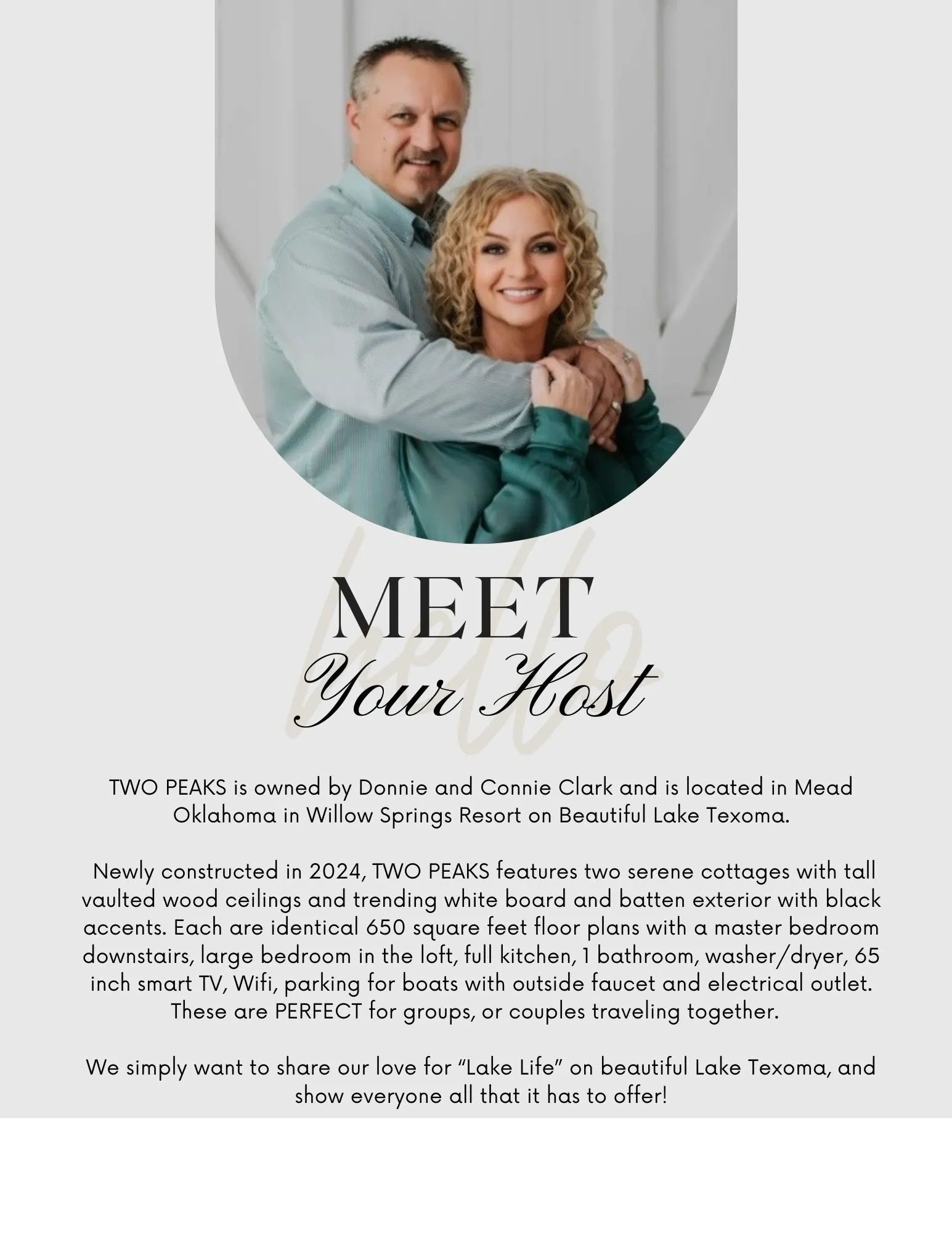 Welcome to Two Peaks Cabins! Nestled in Willow Springs, Lake Texoma less than a mile from the shores of Lake Texoma. We are dedicated to providing a peaceful retreat for guests seeking relaxation and adventure. Our newly constructed cabins combine modern amenities, tall vaulted ceilings, and sophisticated with a crisp clean feel, making them the perfect getaway.