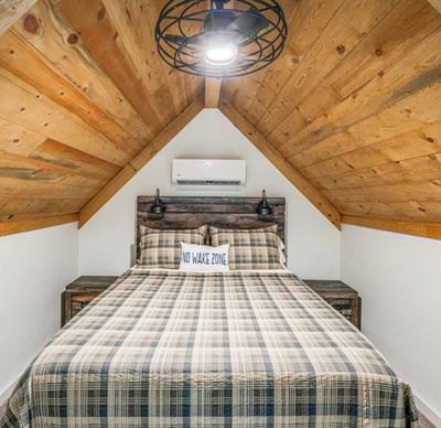 Master Bedroom downstairs with Queen Bed, Bedroom in loft with Queen Bed, and one of the cabins offers a full size sofa sleeper. One cabin sleeps 4 and the other sleeps 5-6.